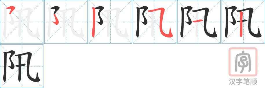 简体部首:阝部 部外笔画:3画 总笔画:5画 造字法: 可拆字为“阝 卂”