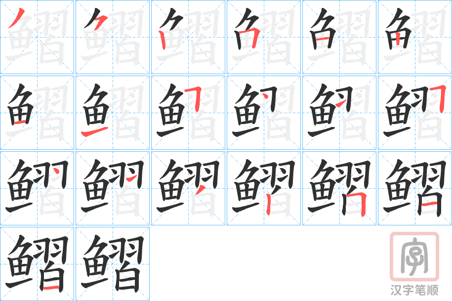 简体部首:鱼部 部外笔画:11画 总笔画:19画 造字法:形声:从鱼、习声 可拆字为“鱼 習”