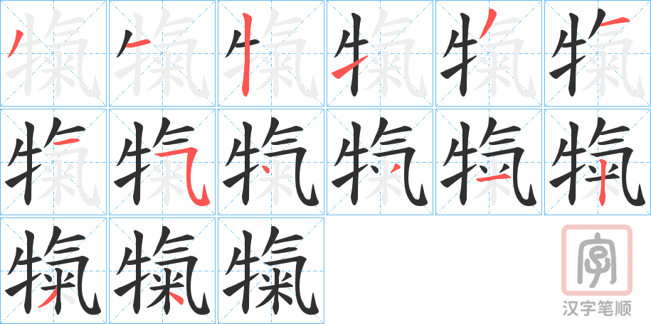简体部首:牜部 部外笔画:10画 总笔画:14画 造字法: 可拆字为“牛 氣”