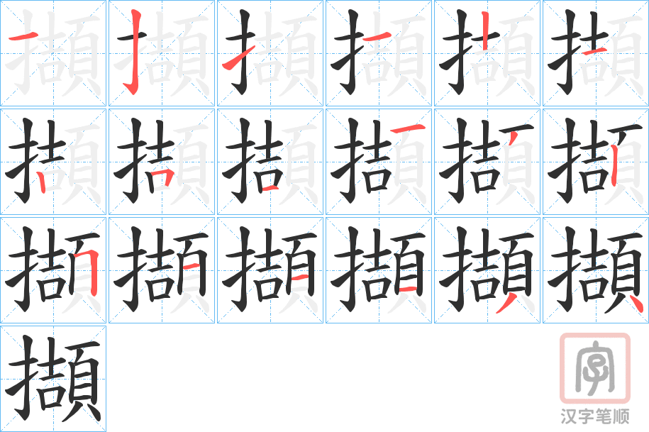 简体部首:扌部 部外笔画:15画 总笔画:18画 造字法: 可拆字为“扌 頁(頡)”