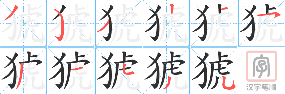 简体部首:犭部 部外笔画:8画 总笔画:11画 造字法:会意 可拆字为“犭 虎”
