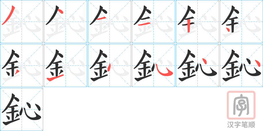 简体部首:釒部 部外笔画:4画 总笔画:12画 造字法: 可拆字为“金 心”