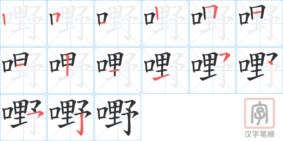 简体部首:口部 部外笔画:11画 总笔画:14画 造字法: 可拆字为“口 野”