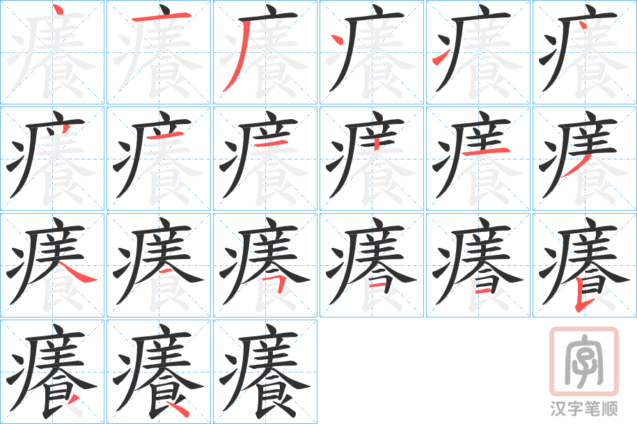 简体部首:疒部 部外笔画:14画 总笔画:19画 造字法: 可拆字为“疒 養”