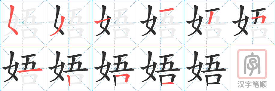 简体部首:女部 部外笔画:7画 总笔画:10画 造字法: 可拆字为“女 吾”