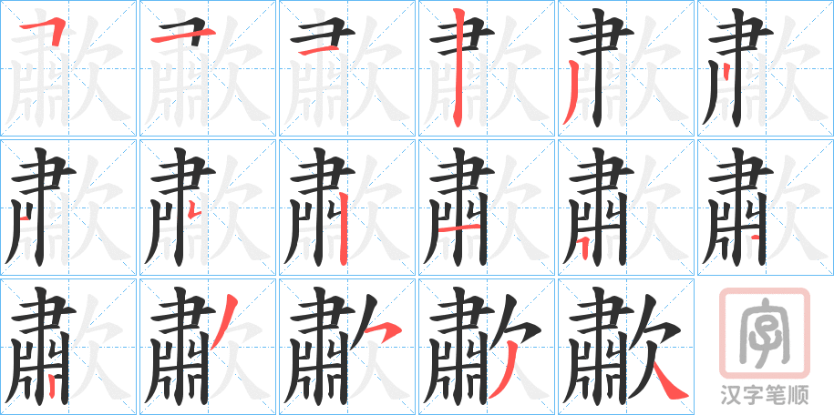 简体部首:欠部 部外笔画:13画 总笔画:17画 造字法: 可拆字为“肅 欠”