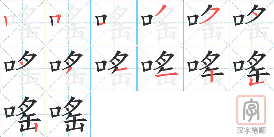 简体部首:口部 部外笔画:10画 总笔画:13画 造字法: 可拆字为“口 摇音(䍃)”