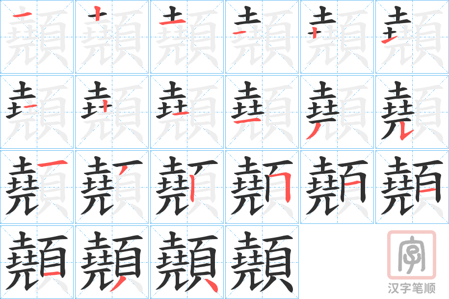 部首:頁部 部外笔画: 12画 总笔画:21画 康熙字典:顤(21画)