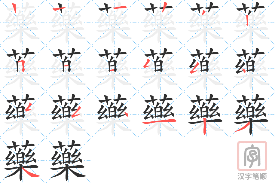 部首:艹部 部外笔画: 15画 总笔画:18画 康熙字典:藥(21画)