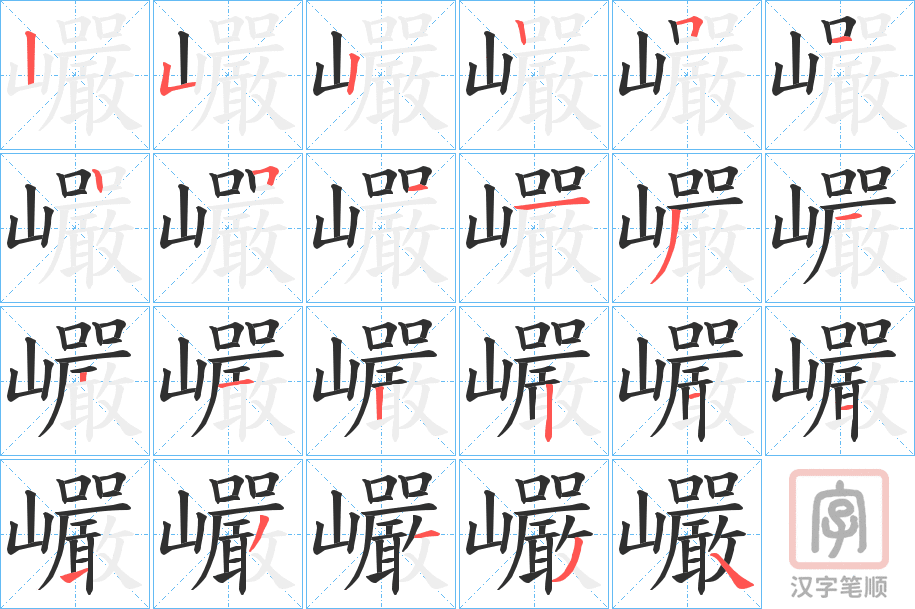 简体部首:山部 部外笔画:19画 总笔画:22画 造字法: 可拆字为“山 嚴”