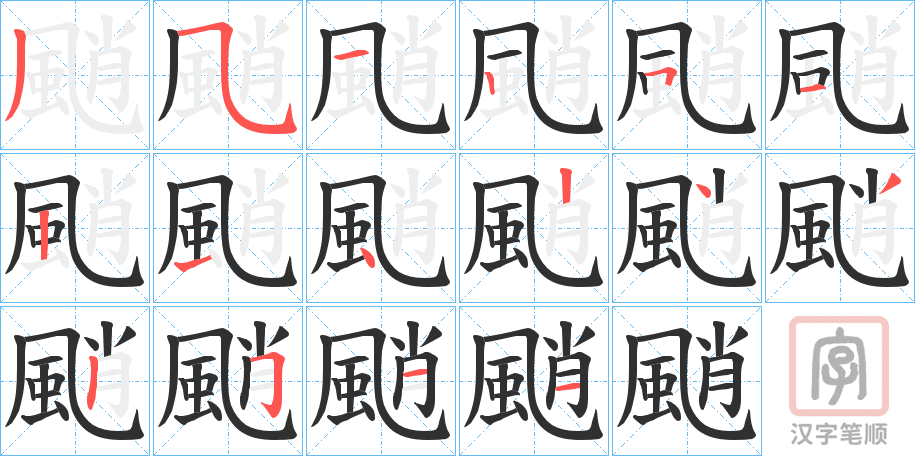 简体部首:風部 部外笔画:7画 总笔画:16画 造字法: 可拆字为“風 肖”