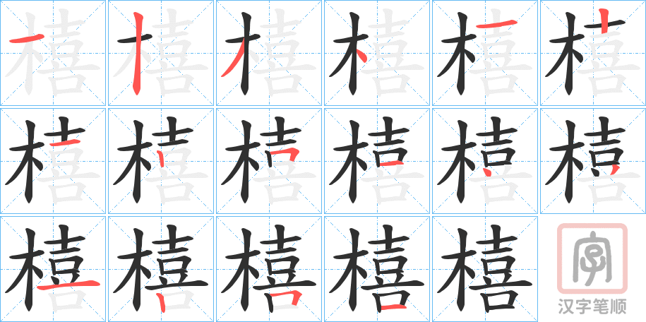 简体部首:木部 部外笔画:12画 总笔画:16画 造字法: 可拆字为“木 喜”
