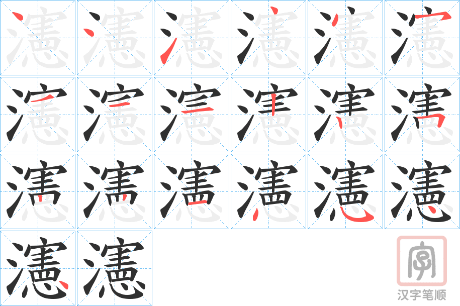 简体部首:氵部 部外笔画:16画 总笔画:19画 造字法: 可拆字为“氵 憲”