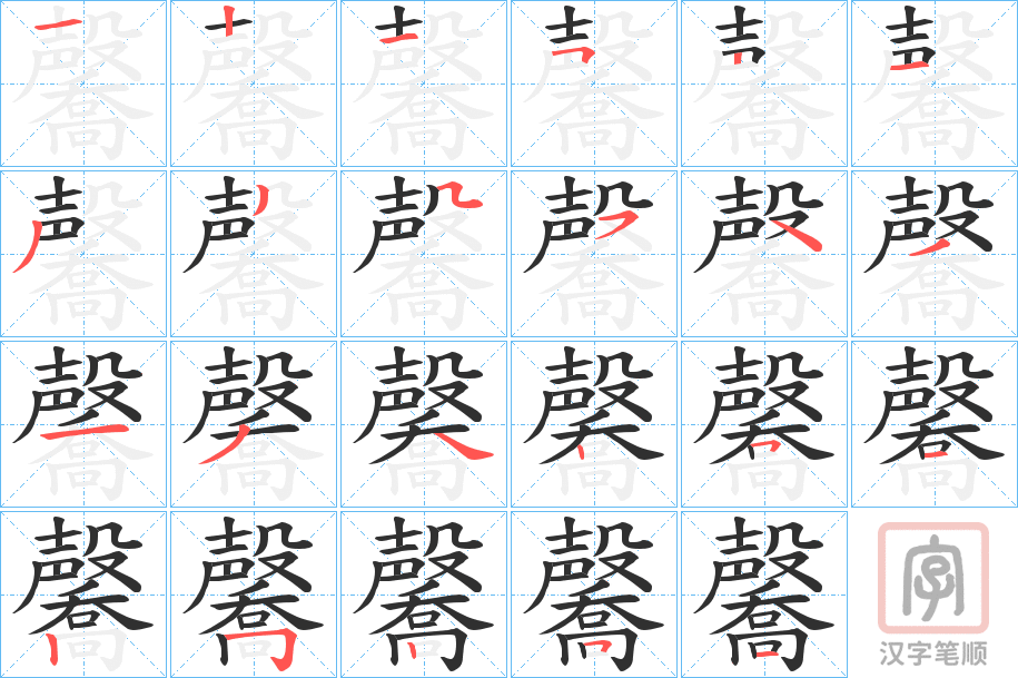 简体部首:殳部 部外笔画:19画 总笔画:23画 造字法: 可拆字为“声(殸) 喬”