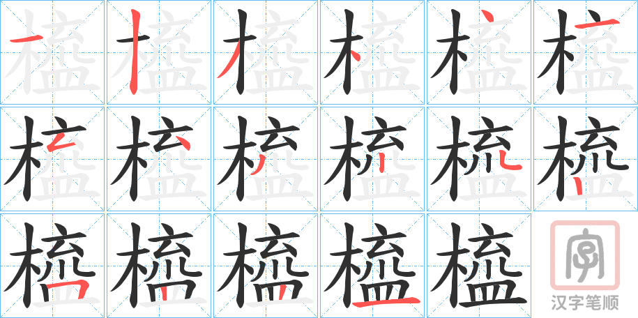 简体部首:木部 部外笔画:12画 总笔画:16画 造字法: 可拆字为“木(梳) 皿”