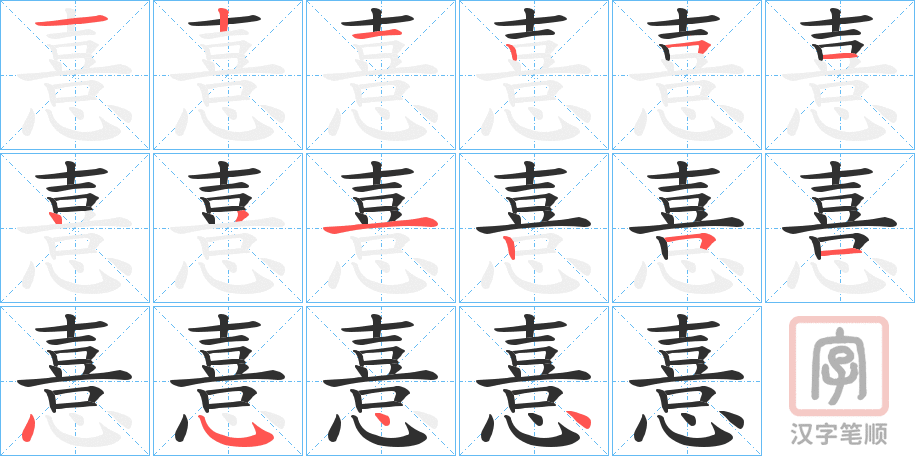 部首:心部 部外笔画: 12画 总笔画:16画 康熙字典:憙(16画)