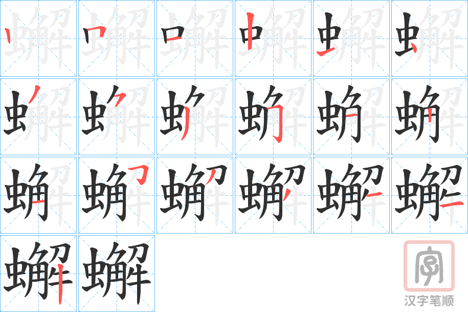 简体部首:虫部 部外笔画:13画 总笔画:19画 造字法: 可拆字为“虫 解”