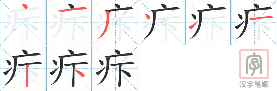 部首:疒部 部外笔画: 3画 总笔画:8画 康熙字典:疜(8画)
