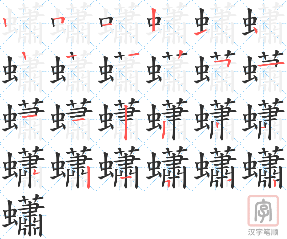 简体部首:虫部 部外笔画:16画 总笔画:22画 造字法: 可拆字为“虫 蕭”
