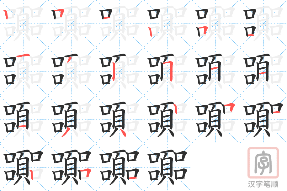 简体部首:口部 部外笔画:18画 总笔画:21画 造字法: 可拆字为“口(吕) 頁 四叠字”
