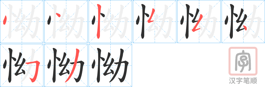 简体部首:忄部 部外笔画:5画 总笔画:8画 造字法: 可拆字为“忄 幼”