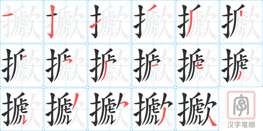 简体部首:扌部 部外笔画:14画 总笔画:17画 造字法: 可拆字为“扌(搋) 欠(歋)”
