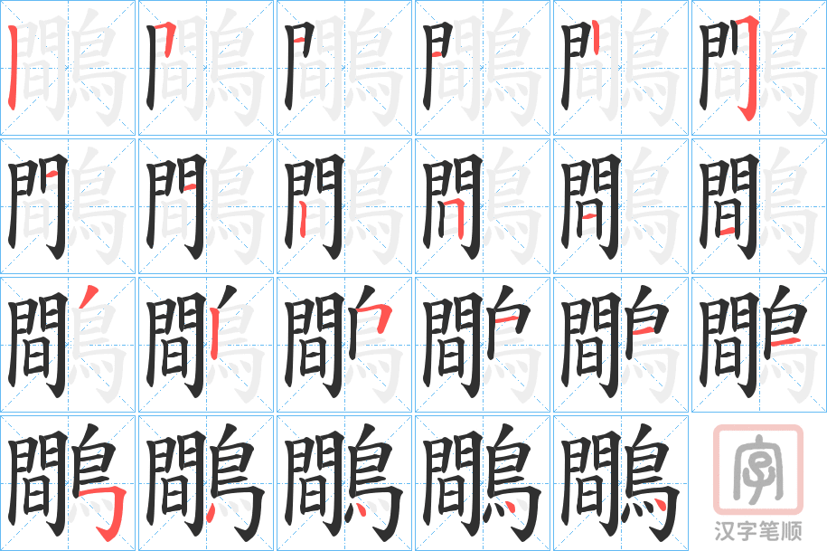 简体部首:鳥部 部外笔画:12画 总笔画:23画 造字法: 可拆字为“間 鳥”