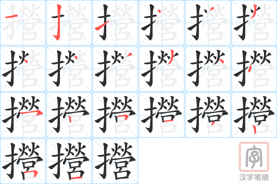 简体部首:扌部 部外笔画:16画 总笔画:19画 造字法: 可拆字为“扌 營”