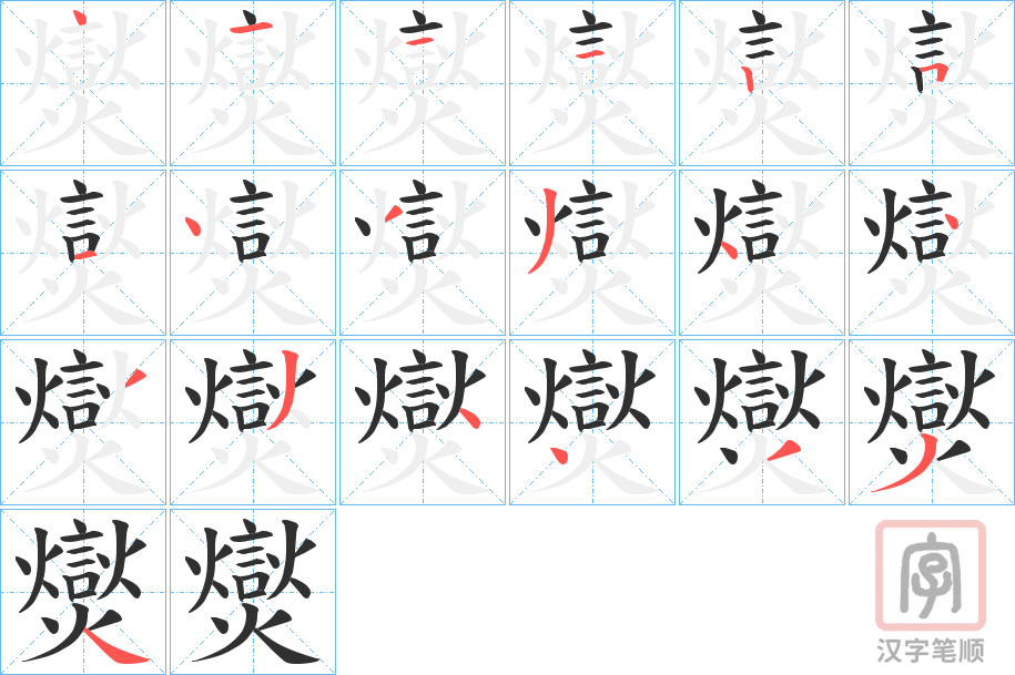 部首:火部 部外笔画: 15画 总笔画:19画 康熙字典:爕(20画)