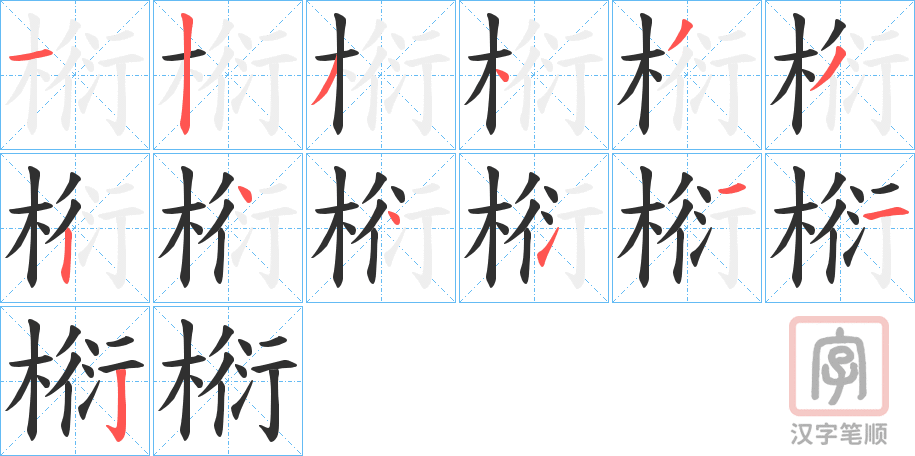 简体部首:木部 部外笔画:9画 总笔画:13画 造字法: 可拆字为“木 衍”