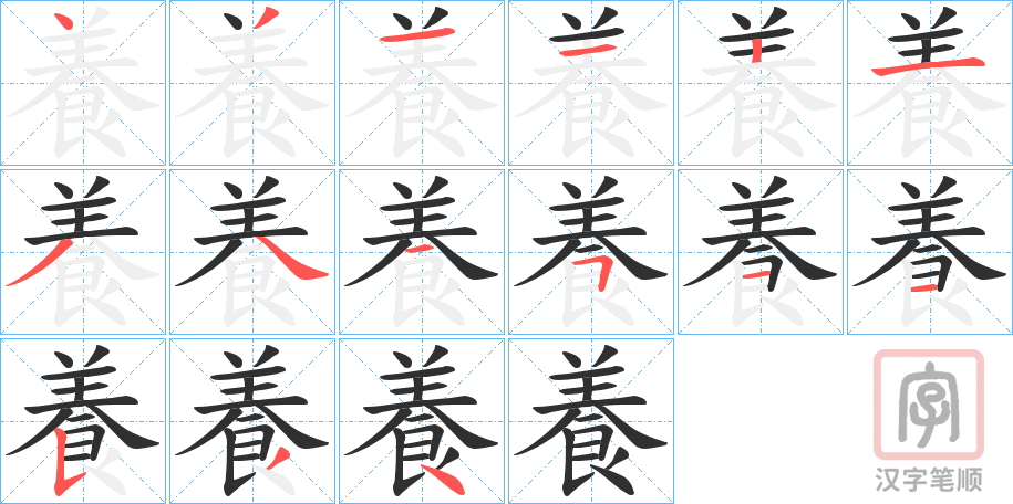 统一码:990a 笔顺编号: 43111344511534 笔顺读写:捺撇横横横撇捺捺折横横折撇捺 養的笔顺 丶ノ一一一ノ丶丶フ一一フノ丶