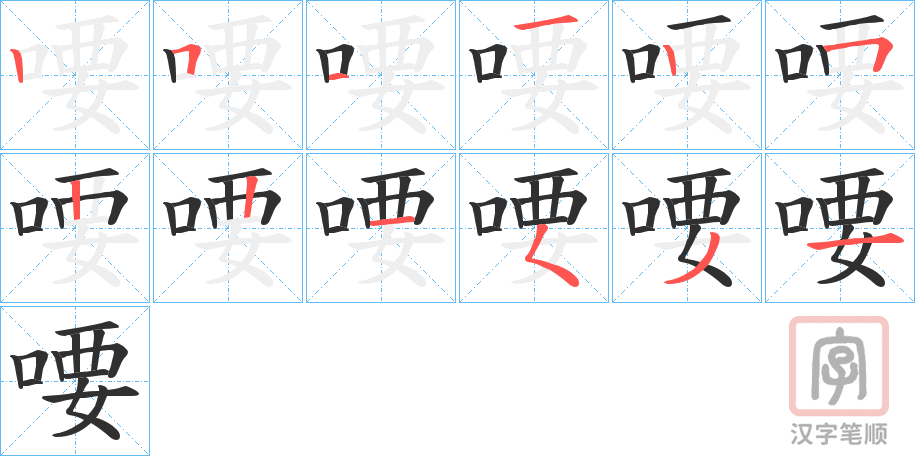 部首:口部 部外笔画: 9画 总笔画:12画 康熙字典:喓(12画)