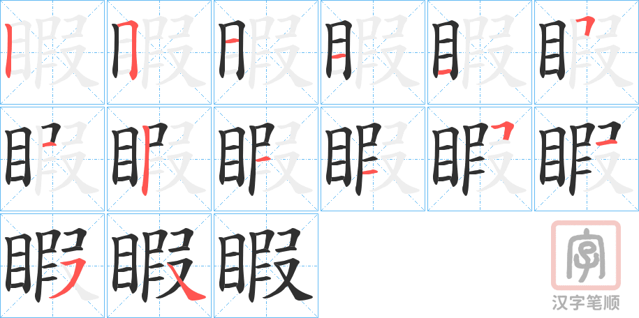 简体部首:目部 部外笔画:9画 总笔画:14画 造字法: 可拆字为“目 叚”