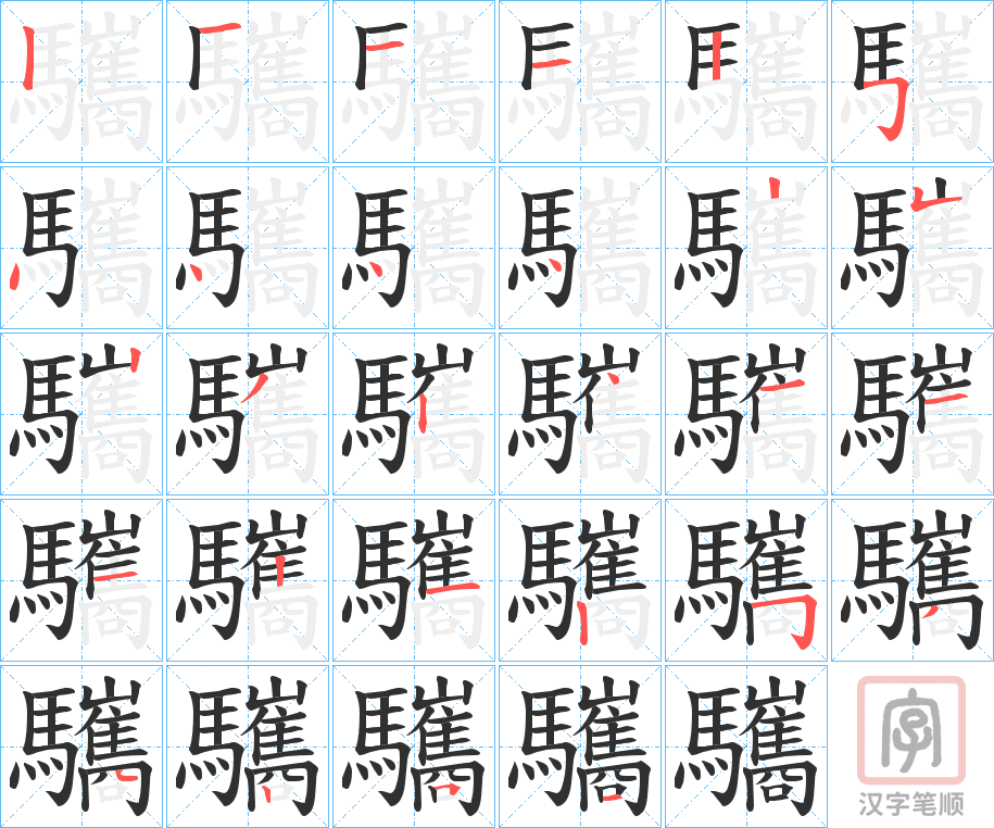 简体部首:馬部 部外笔画:18画 总笔画:28画 造字法: 可拆字为“馬 冏(巂)”