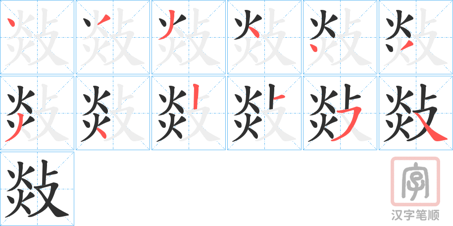 简体部首:攴部 部外笔画:8画 总笔画:12画 造字法: 可拆字为“炎 攴”