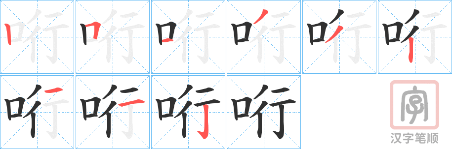 简体部首:口部 部外笔画:6画 总笔画:9画 造字法: 可拆字为“口 行”