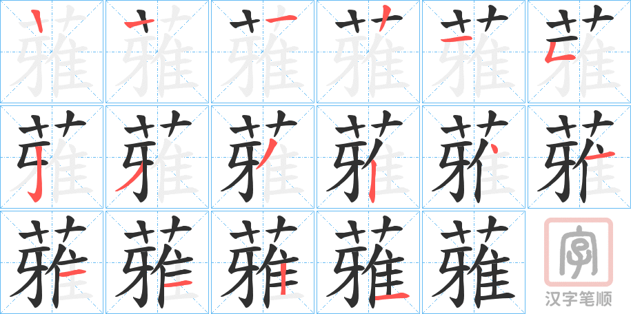 简体部首:艹部 部外笔画:12画 总笔画:15画 造字法: 可拆字为“艹 雅”