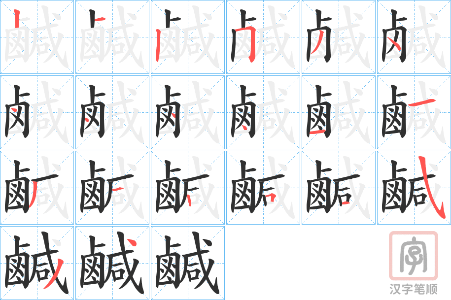部首:鹵部 部外笔画: 9画 总笔画:20画 康熙字典:鹹(20画)