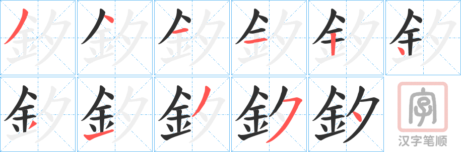 简体部首:釒部 部外笔画:3画 总笔画:11画 造字法: 可拆字为“金 夕”