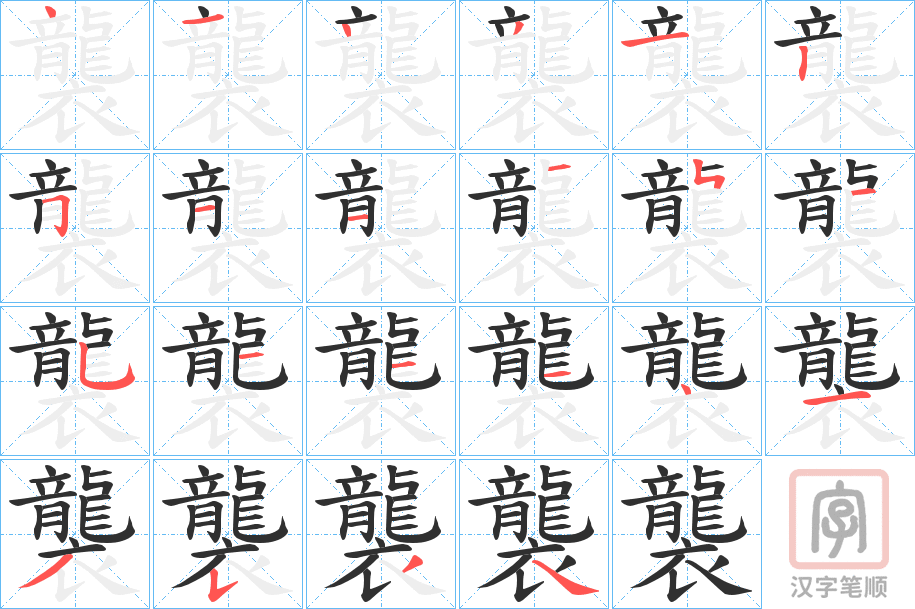 部首:衣部 部外笔画: 17画 总笔画:23画 康熙字典:襲(22画)