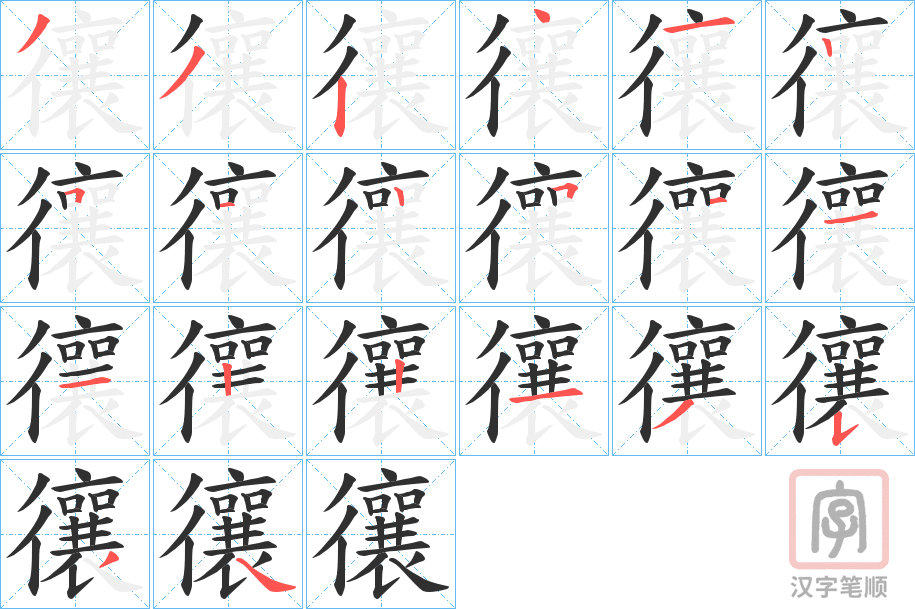简体部首:彳部 部外笔画:17画 总笔画:20画 造字法: 可拆字为“彳 襄”