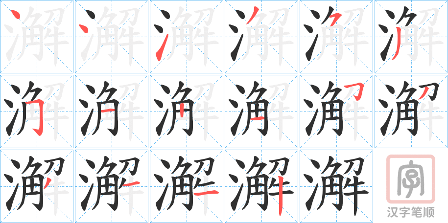 简体部首:氵部 部外笔画:13画 总笔画:16画 造字法:形声:从氵、解声 可拆字为“氵 解”